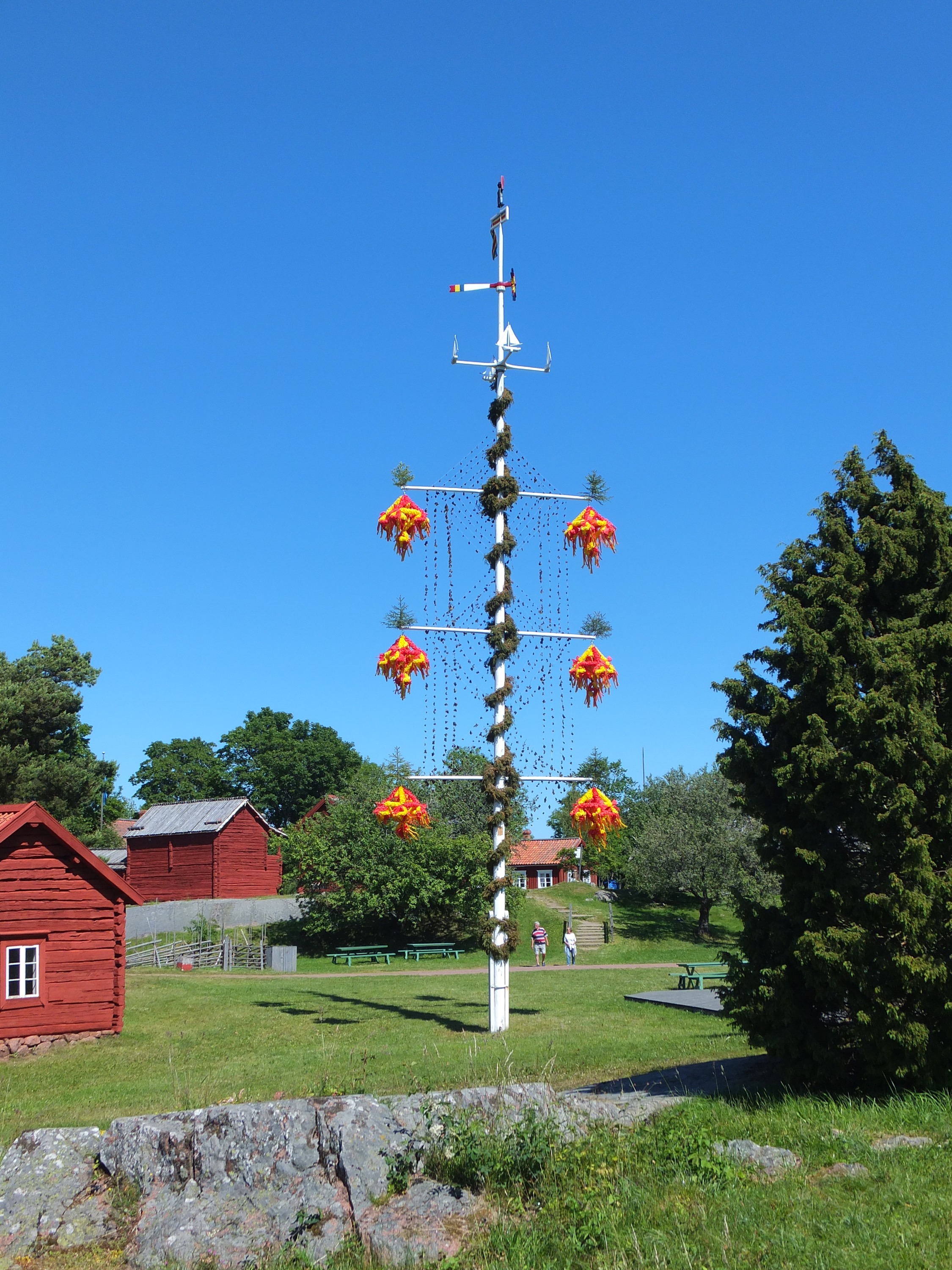 That Castle was quite impressive, mostly, from the outside, of the enormous area of wall compared to the miniscule ‘windows’. Inside I didn’t see, as it was closed. But more interesting was the collection of old buildings on the way there. (I’ll think of the name soon). Ålands official Maypole is erected and celebrated there, and most impressive it was too: