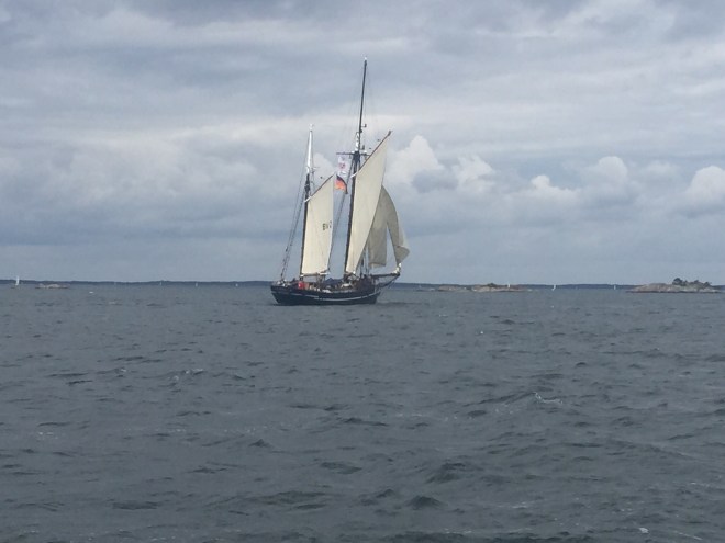 Plenty wind today, sailable WSW for several hours before it veered gradually before we got near Vestervik and came on the nose again, and so on with the trusty engine. Lots of boats going north and enjoying the sailing, including this one: Splendid sight, majestically gently speed, and waving others past with smiles.