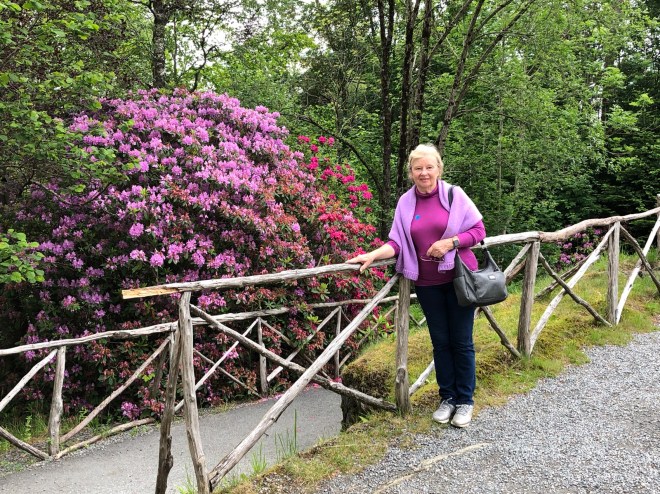 M wished to see Greig’s place at Troldhaugen, so we asked at the tourist office how to get there. Bybanen. Get off at Hop, and walk from there. So we did, and were a bit wobbly-weary in the legs on arrival, nearly an hour later, having negotiated many incorrect wiggly roads and hills on the way. NB. There is a bus. We took it, back to town later. A well-earned restorative cuppa before a tour of the garden, M colour-coded,