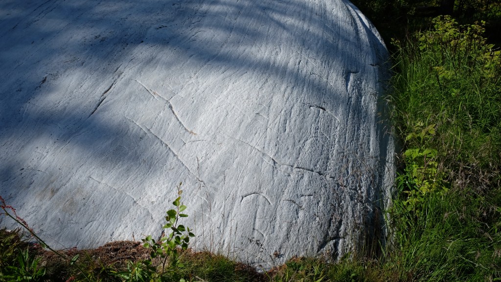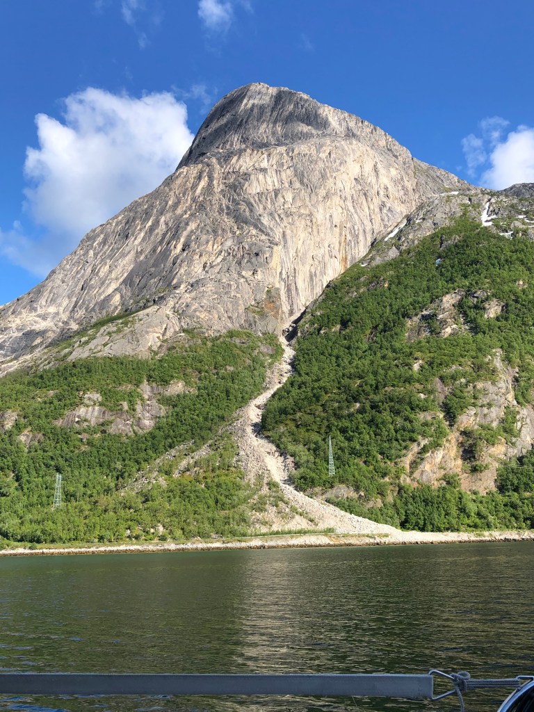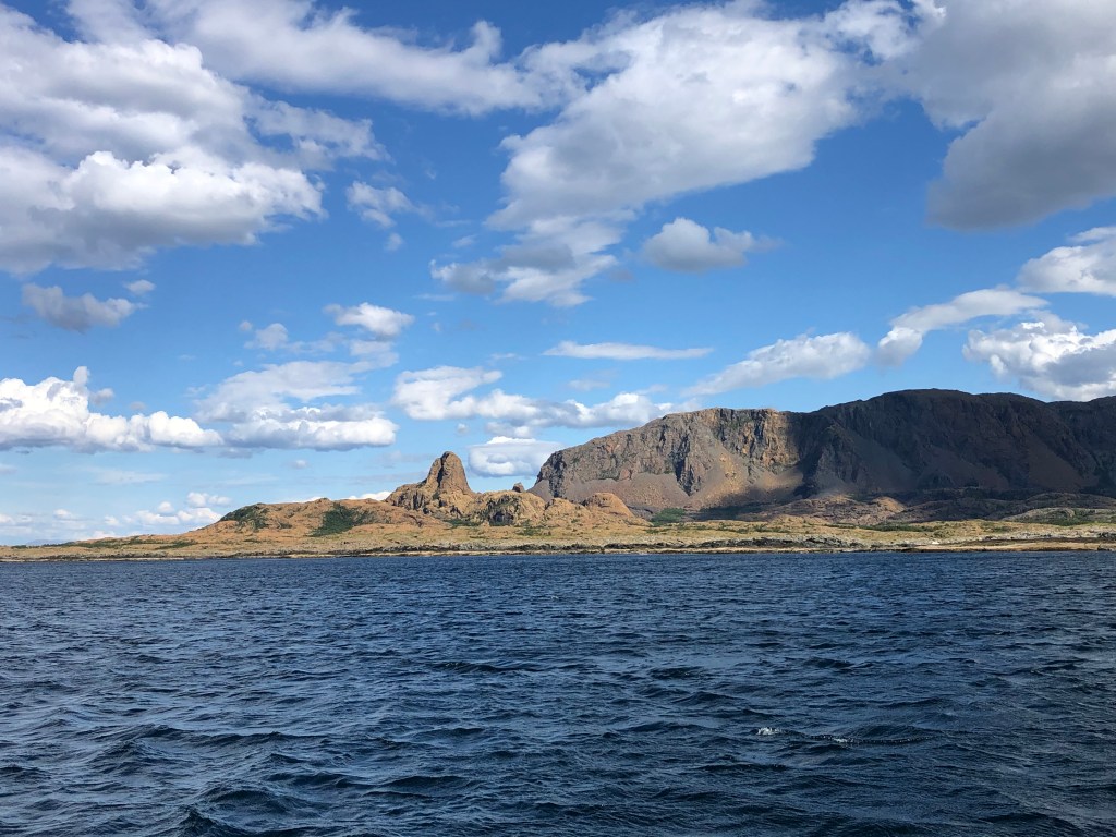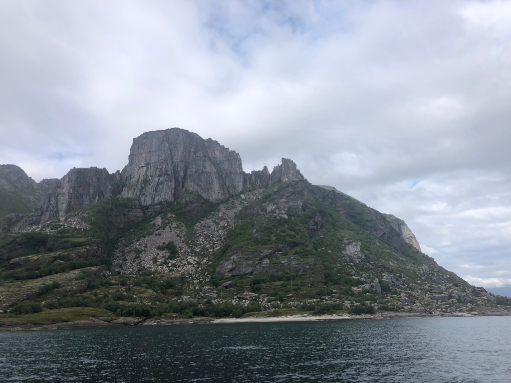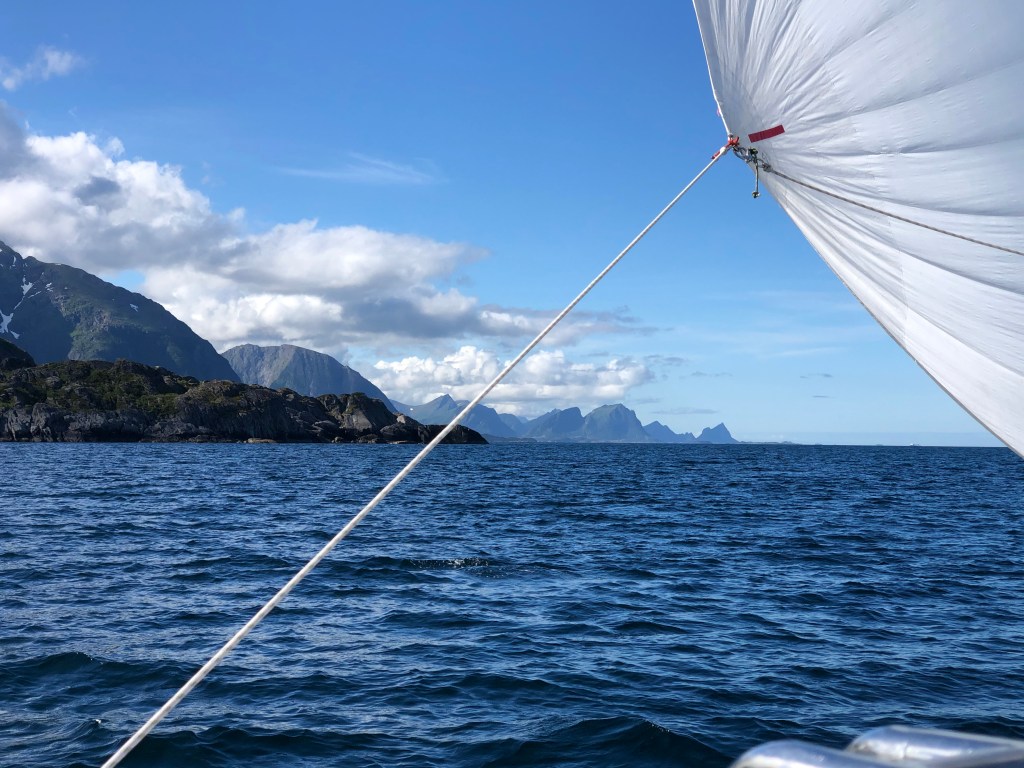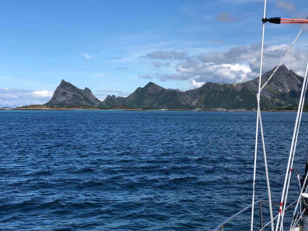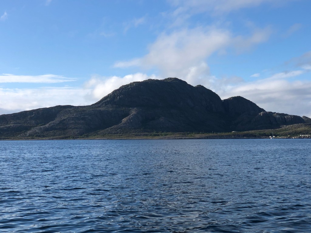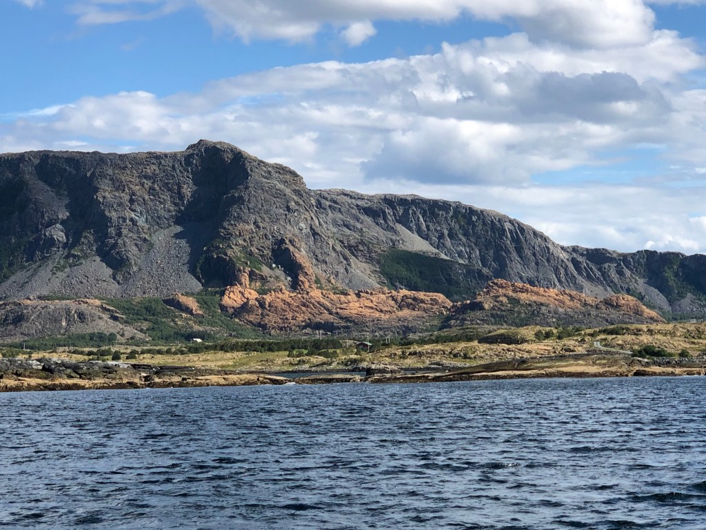So, wind on the port quarter, fairly strong at 15 – 20 kts. Unroll genua, sheet in, stop engine and enjoy good speed. And rolling. Wind had managed to whip up waves. Coffee had to wait. Managed to sail round the west side of Leka, almost all the way to a little, tucked away bay sheltered from the wind, which we had visited many years go, Sjøvik. (65 04.6 / 011 22.2). On the way there were sights of rock of many colours and shapes: Leka is renowned.