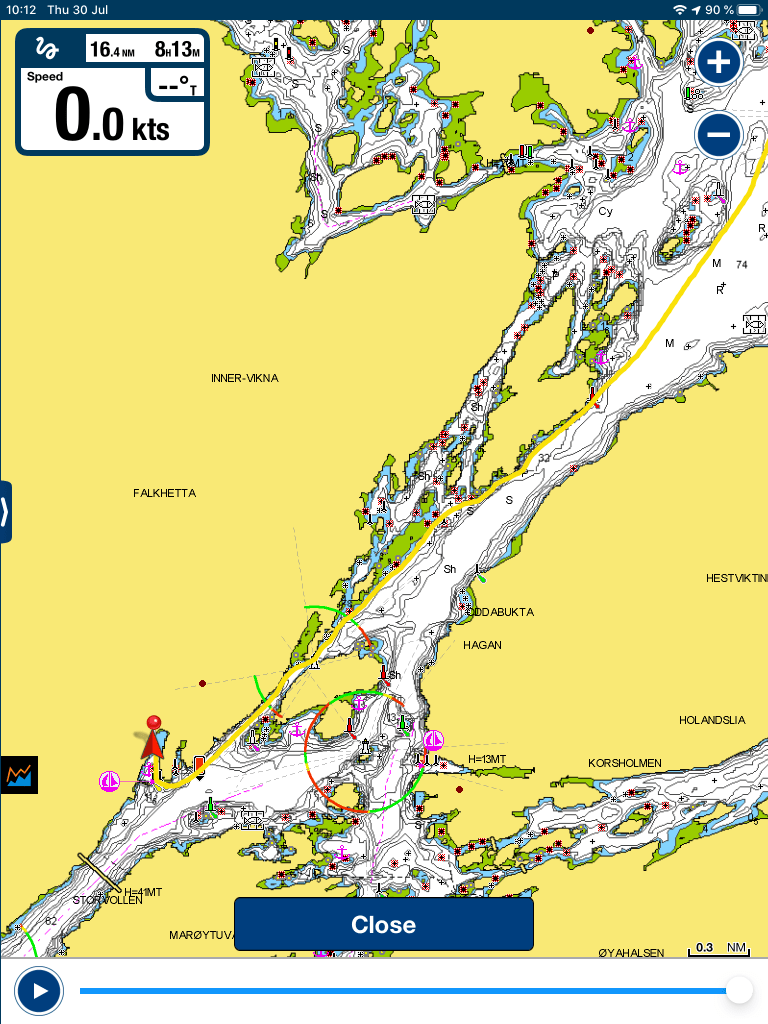 Woke to overcast and drizzle, so dallied and read a chapter or two before leaving Sjøvik, on Leka. No wind to speak of so more use of diesel. Nearing Rørvik we met the tidal current, going north and against of course. The narrower the fairway, the stronger the current, and when it increased to well over two knots, I took action and sought the shallows, where it wasn’t so strong. Our track is revealing: Followed mostly the 5 meter depth contour on the wonderful electronic chart. No surprises luckily.
