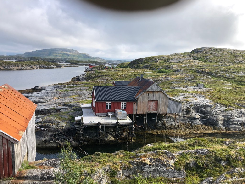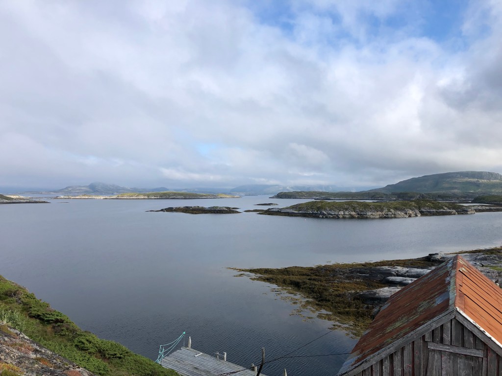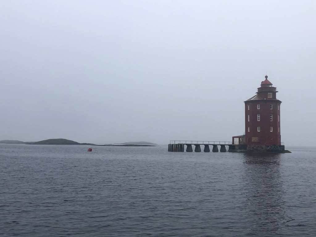 Left Rørvik early, the forecast was for winds against, increasing later. Check, but we got to Villa, motoring, before that happened. Villa is where the very first lighthouse was built in Norway, 1839, coal fired, and I’d hoped to make it a visit. But it wasn’t on the top of the hill next to the harbour, but a good long way away. Having negotiated the rather uneven “path” thither for a few hundred meters, and a conference with my knees, we decided to return to boat. Mission unaccomplished. Pottered about instead. The harbour is one of the least-inviting I have seen, but the visitors pontoon is luckily more friendly. Harbour building perched on the steep side of a very narrow channel. Nice view though.