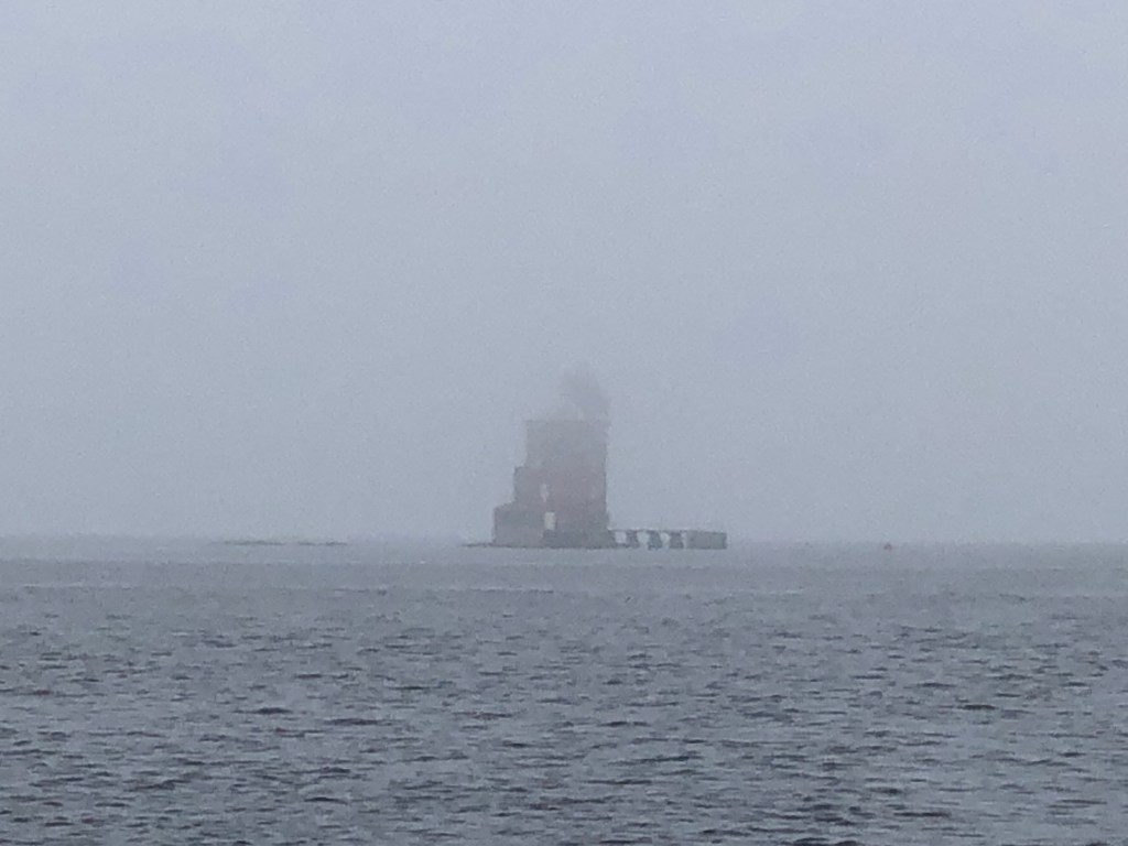 Next morning was strange. Absolutely calm and silent, due to very low cloud, almost fog. Even the gulls remained quiet. However, we set off in the forecast hope of improvement. It was eerie. Cloudbase was very variable, apparently just over mast-height occasionally, and visibility about a mile. A landmark (or should that be seamark?), lighthouse came and went, clear on approach, foggy on departure: Weird!