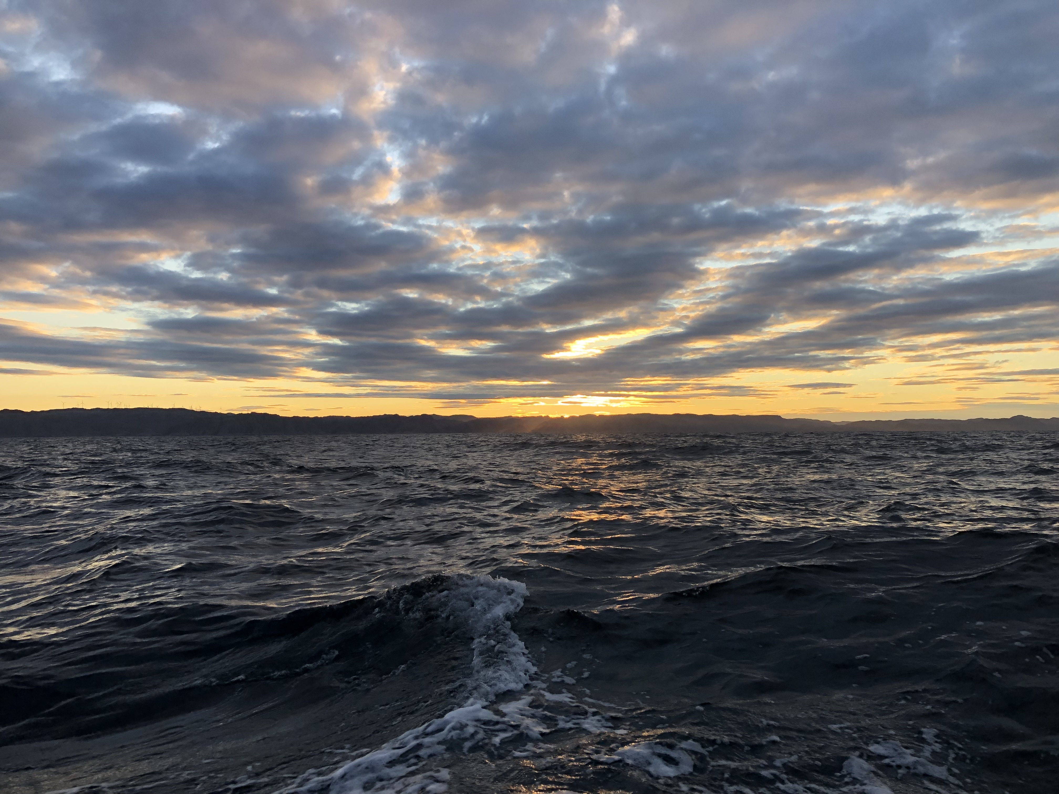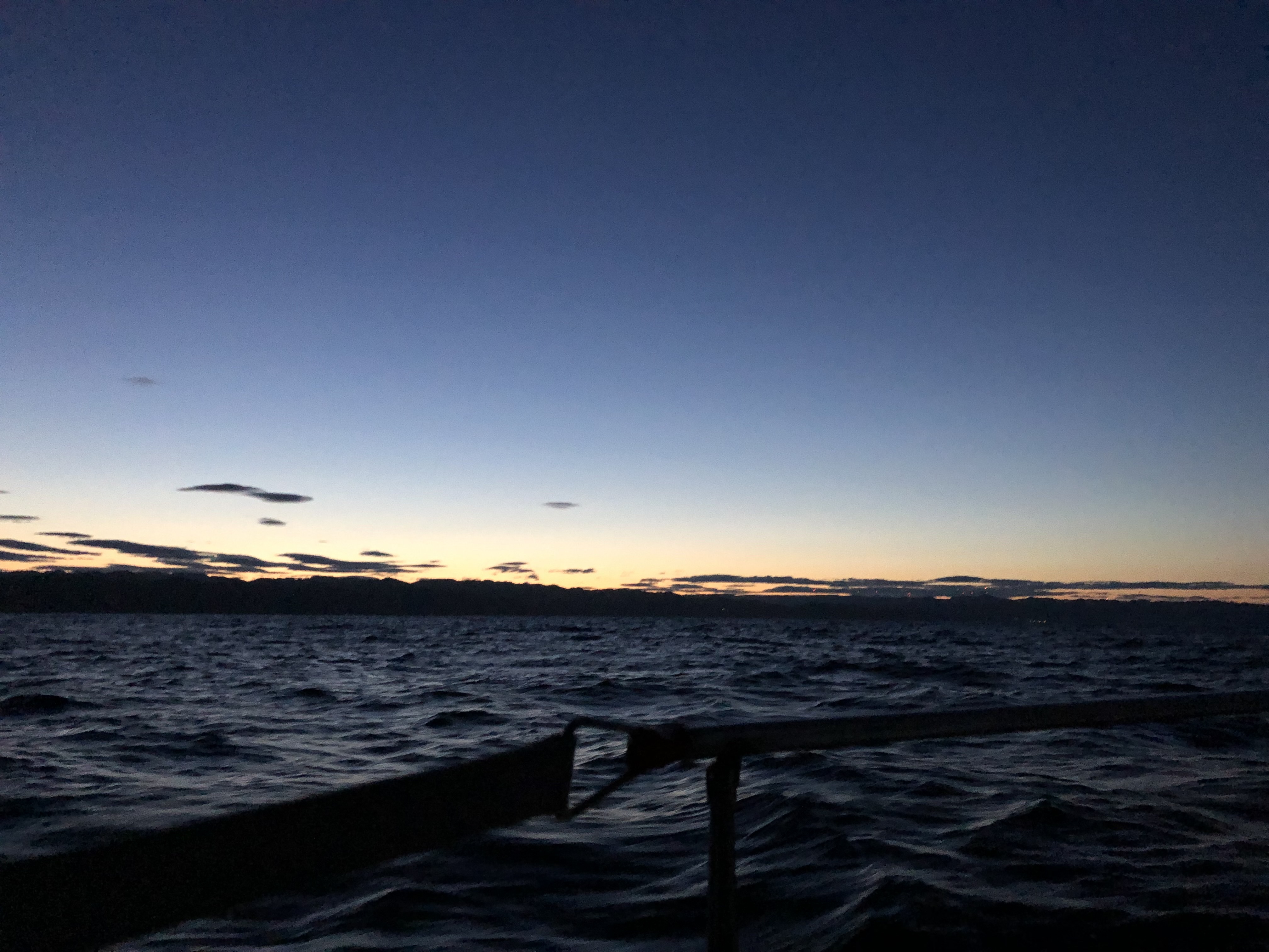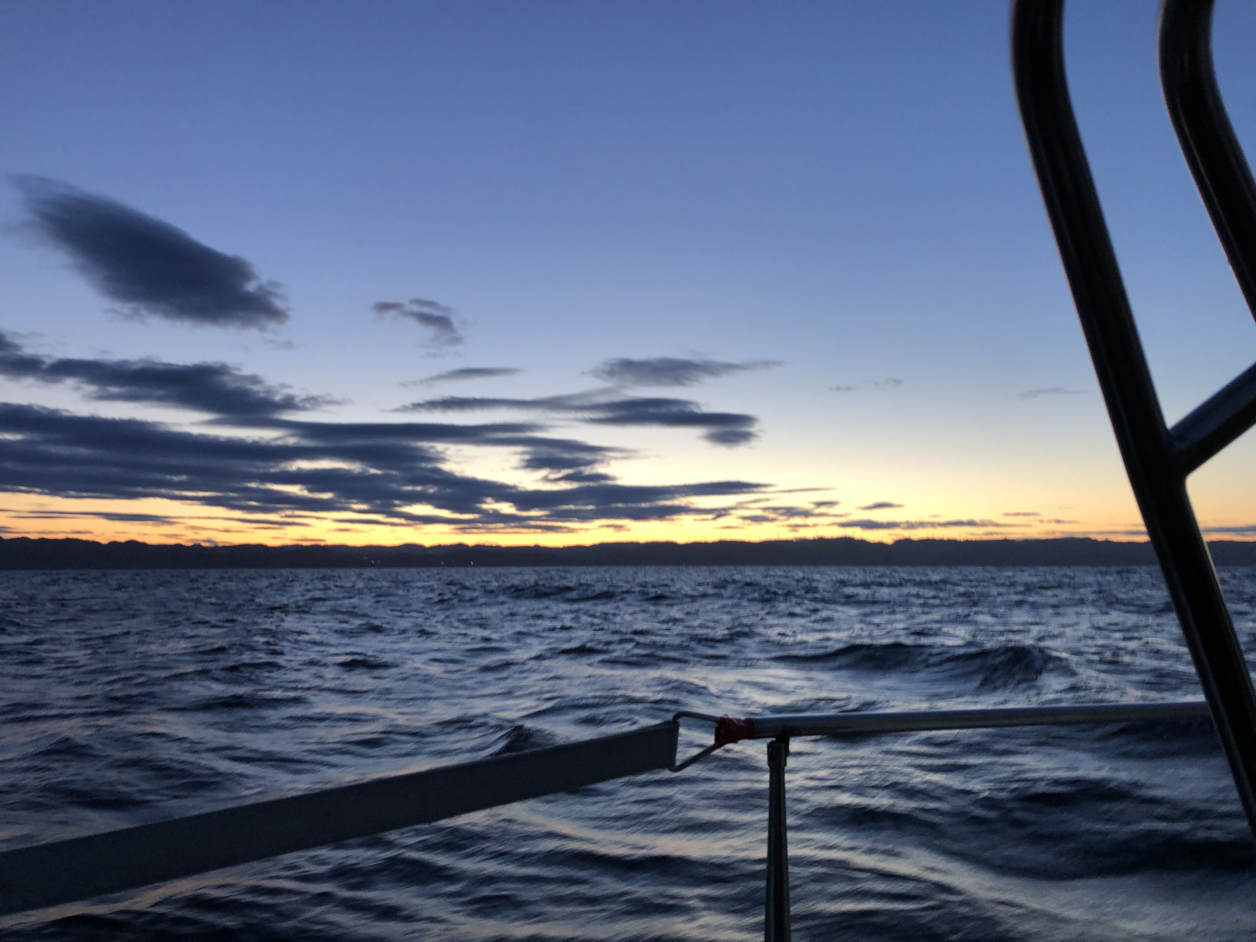 A comfortable train ride back to Egersund the next day got me to Josin at about 9 and a detailed study of the various weather forecasts. Conclusion being that there was a weather window the next day if we started early enough to get round Lista, the westerly of the two bits of southern Norway which stick out and cause weather problems. OK. Alarm for 02:00, cuppa, (too early for breakfast), and away at 03:05. Very dark indeed. Night navigation skills a bit rusty, but modern electronic charts and screens helped awaken them. It is a very long time since I was away from the light «noise» of civilisation, and the night sky was a joyful kaleidoscope of stars, and probably planets, the brightest ones. All too soon dawn crept into the sky, the stars went home, and light increased.