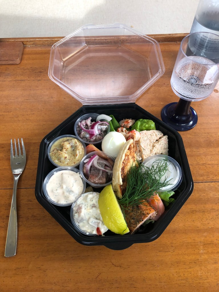 Went ashore, just in time before the shop shut. The local “fish and smokery” shop. So many variants, all succulently inviting. As it was now nearly dinner time, I bought this: