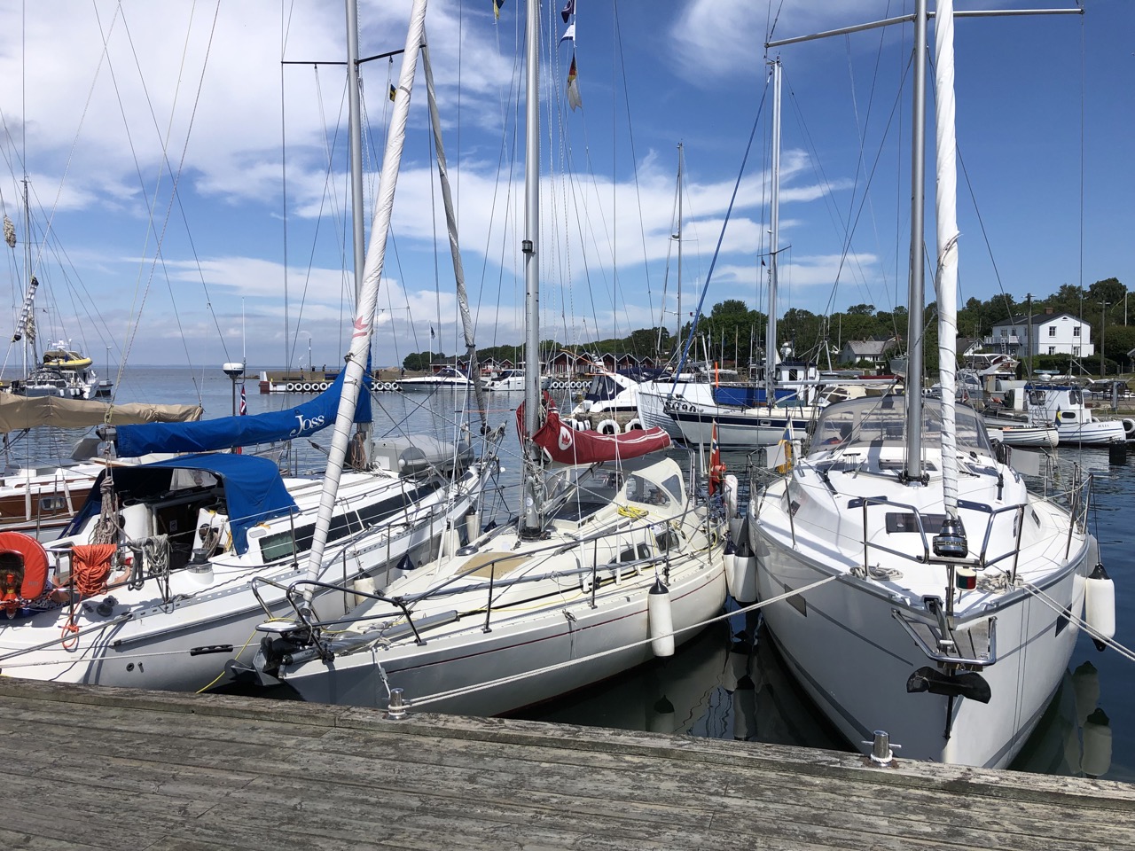 Hanö harbour has limited longside capacity, and we arrived probably last, so a bow-in tie-up had to be negotiated. This involves motoring gently forward until stopping within boathook-reach of an intended rope dangling tantalisingly from the quay. This is attatched at the other end to something solid about 15 meters away on the seabed. You lift it out of the water and pull on it. It is the stern anchor. You belay it to the stern somewhere. By this time the quay has retreated, so you motor forward again, letting out just enough of that stern rope so that you don’t bump. Rush forward with mooring rope in hand, jump ashore and tie onto something solid. Breath out. Another bow rope. Adjust everything such that there is a jumpable gap at the bow. Take in admiring comments from the neighbouring boat. (He could have helped, but maybe he came in earlier and was well into the wine. He maybe deserved it!).
