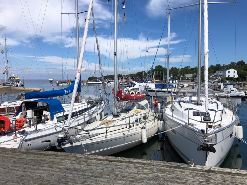 Forecast was for more sunshine, and again SE winds, of tempting strength, so Plan A was for distant Hanö island, with Plan B Brantevik or Simrishavn, but an early start was indicated. Didn’t wake up in time though, nevermind, so we left Ystad at 09:00. Perfect sailing, in company with several other sailing boats ahead, enjoying the conditions. A bit rolypoly at times, but invigorating. Max boat speed all the way to the southernmost point of Sweden, then turn north east, were the waves subsided, leaving sailing even better. Full speed past Brantevik, then Simrishavn, obviously, and head straight for Hanö, only 30 nm away. This is Life! More of that dark-cloud weather brewing to the west seemed to be having a positive effect on our wind, the clouds disintegrating and exhaling grandly. It didn’t last though. About half way to Hanö, as though turning off the fan, the wind died abruptly to a gentle breeze, and the engine had to help, otherwise…. Eventually even the breeze went to sleep, and we boringly motored the rest of the way.