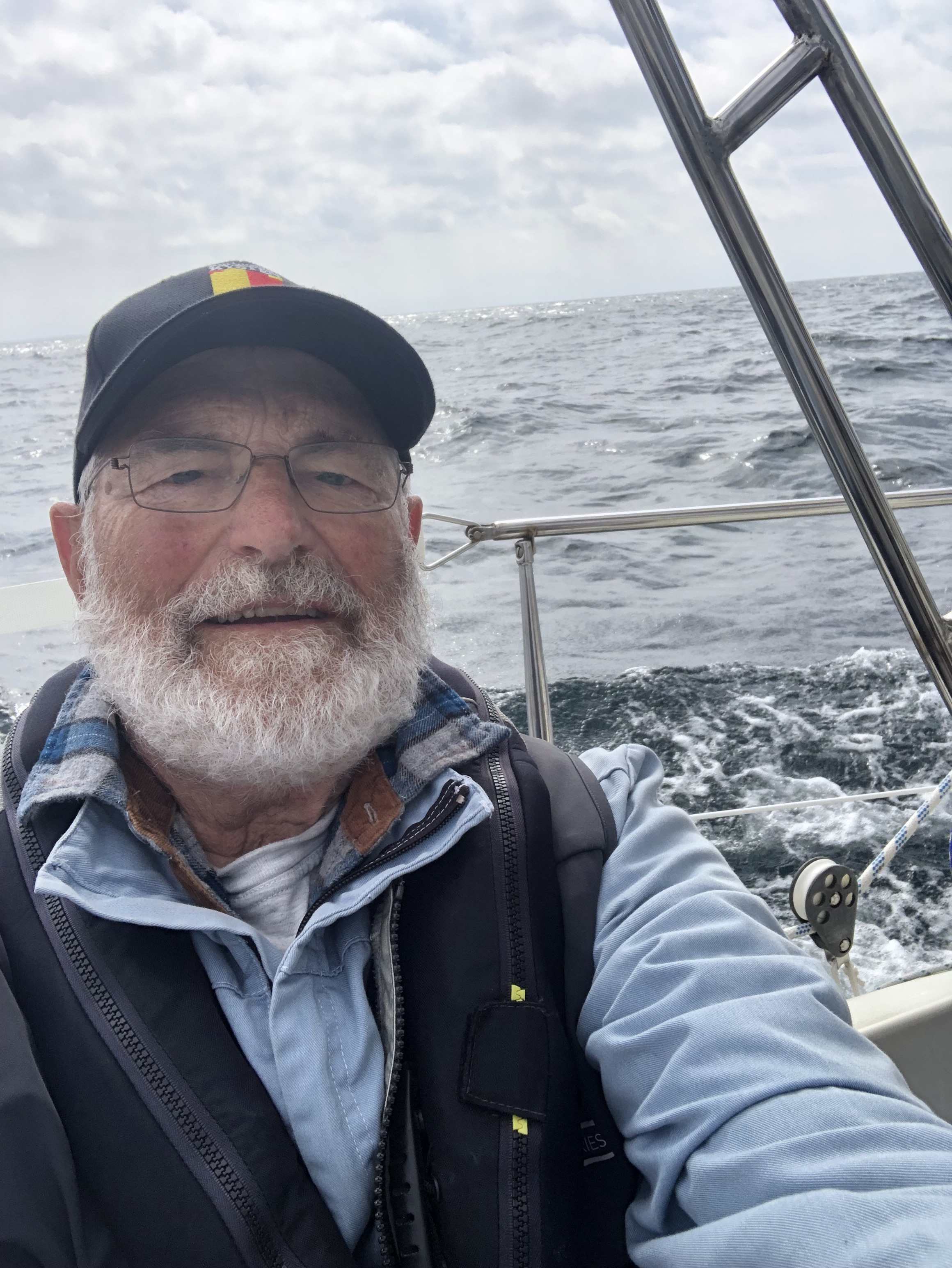 Clearing the island’s lee, sailing conditions duly appeared and we rushed along under full sail in the right direction. Tried to take a pic of the excellent speed!