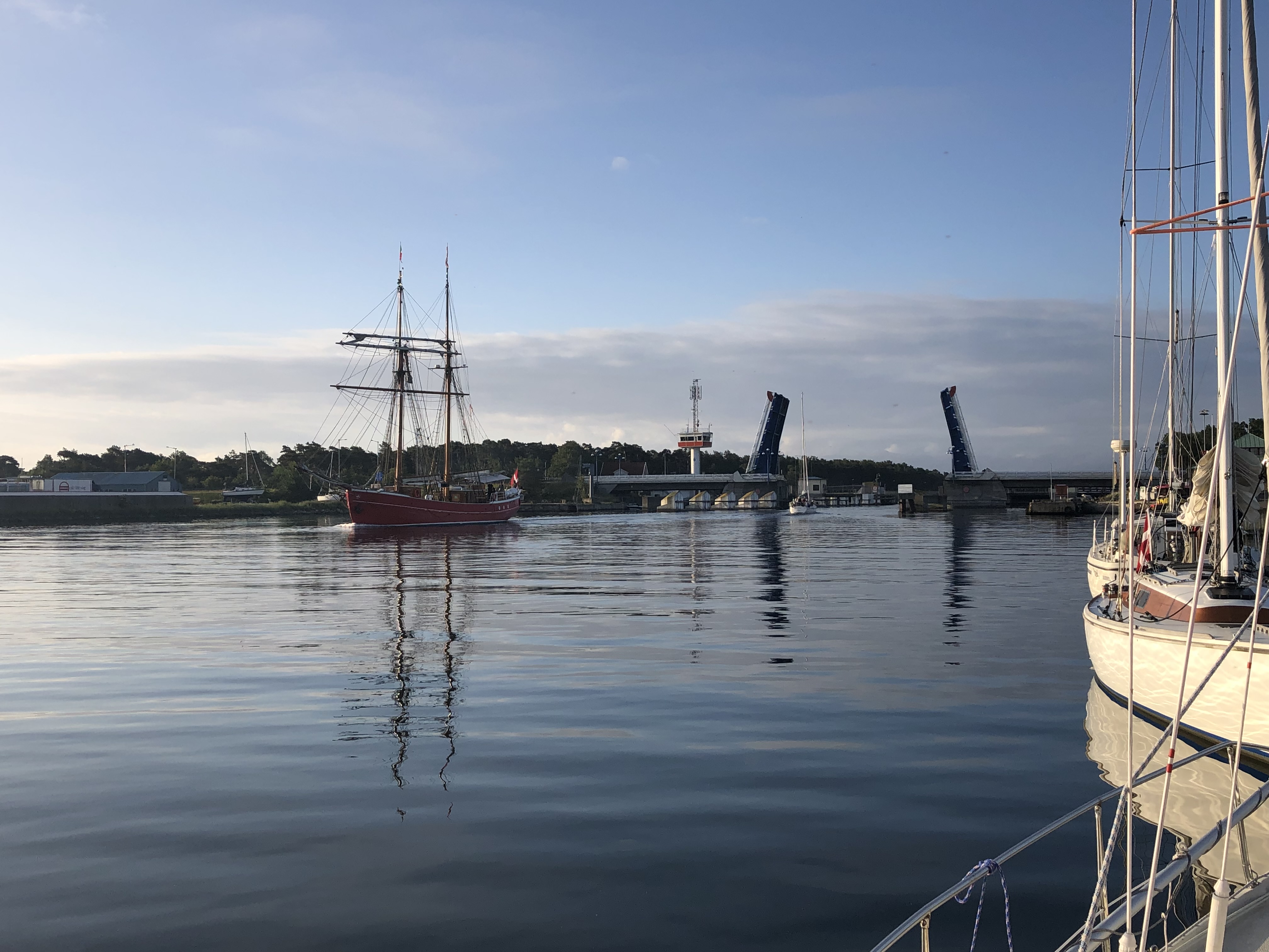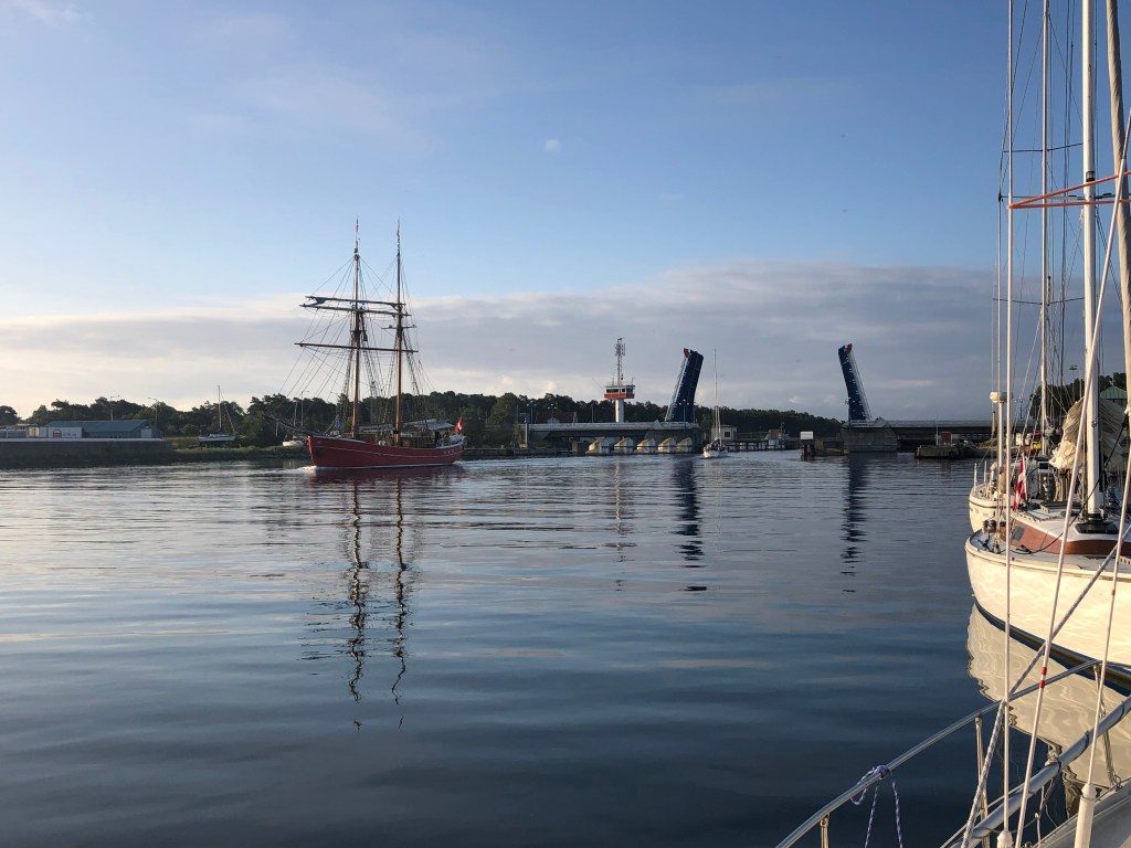 A remarkably few hours later we arrived in Helsingborg, for a shopping-stop and a very good fish soup in the harbour cafe, and then onward, over the Kattegat to the Danish side. Incredible south-going current of 2,5 to 3 knots wanted to push us towards Germany, and with a dying wind, the engine had to help to get us where we wanted to go, to Humlebæk, (55 58.3N 012 32.8E). It started to drizzle just as we got there, and were kindly assisted in tying up by a dripping German couple, who were very interested to hear about our “spots” further north, never mind the rain! A long day soon ended after a quick meal, look at the weather forecast, (for rain until mid morning), and sleep.
